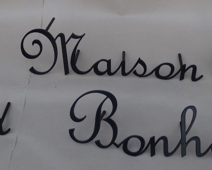 Plaque en fonte pour écluse de Fonsérannes Création du modèle bois de la plaque modèle Traitement Epoxy, finition des lettres (à la main) Résultat de la plaque finie